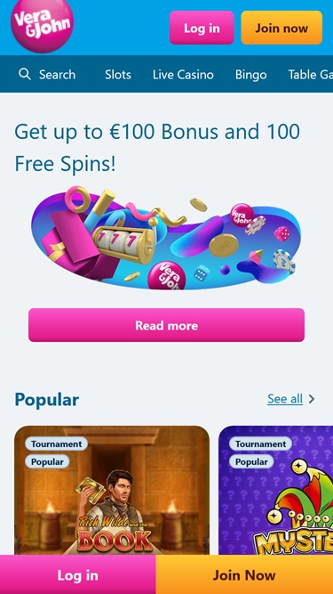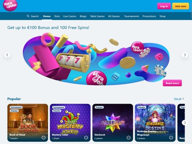 O Cassino Vera John oferece bônus generosos. Todos os novos jogadores têm a oportunidade de receber um bônus de boas-vindas de 100% de até 100 euros em seu primeiro depósito, que deve ser apostado quarenta vezes, de acordo com as regras gerais.