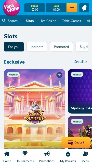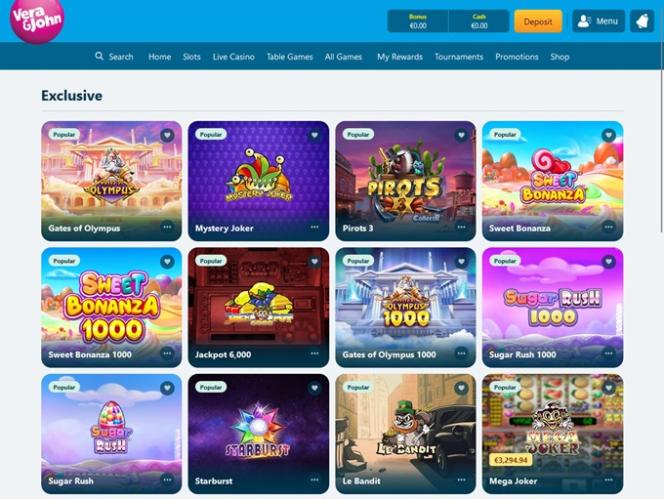 O Vera John Casino é alimentado por Amaya, Microgaming, Net Entertainment, Playtech, BetSoft, 1x2gaming, Barcrest, Big Time Gaming, ELK Studios, Evolution Gaming, EYECON, Ezugi, Genesis Gaming, Habanero Systems, iSoftBet, lightningboxgames, Oryx, Play'n GO, Quickspin, Rabcat, Relax Gaming, Thunderkick, Yggdrasil, Wazdan, Realistic Games, Booming Games, Stakelogic, Pragmatic Play, Nolimit City, Red Tiger Gaming, Booongo, Red Rake Gaming, Fantasma Games, Kalamba, Spin Games, Skywind, Triple Edge Studios, Northern Lights Gaming, Evoplay, Stormcraft Studios, Switch Studios, OneTouch, Electric Elephant Games, Triple PG, Bulletproof Games, All41 Studios, Gluck Games, Gameburger Studios, Slot Factory, Neon Valley Studios, Golden Rock Studios, Shuffle Master, SpinPlay Games, HungryBear Gaming, SmartSoft Gaming, GONG Gaming, Blue Guru Games, Buck Stakes Entertainment, Games Global, 2by2 Gaming, Ash Gaming, Bally Technologies, bluberi, Blueprint Gaming, Endemol Games, Leander Games, NextGen, Push Gaming, Tom Horn Gaming, WMS, Gaming Realms, SG Interactive, Gamomat, Red7Mobile, CORE Gaming, Scientific Games, Side City Studios, Bally Wulff, Iron Dog Studio, Foxium, Betdigital, Just For The Win, The Games Company, Reflex Gaming, Storm Gaming Technology, PearFiction Studios, Wild Streak Gaming, Slingshot Studios, Fortune Factory Studios, Jade Rabbit Gaming, STHLM Gaming, 4ThePlayer, AvatarUX, Gamevy, Crazy Tooth Studio, ReelPlay, Japan Technicals Games, Alchemy Gaming, Rarestone Gaming, Snowborn Games, Boomerang Studios, Hacksaw Gaming, Max Win Gaming, Gold Coin Studios, Bang Bang Games, Slotmill, SilverBack Gaming, Peter And Sons, Aurum Signature Studios, Lucksome Gaming, Area Vegas, RAW iGaming, Bombay Live, Leap Gaming, 3 Oaks Gaming, Wishbone Games, Spribe, Print Studios, Gaming Corps, HammerTime Games, Four Leaf Gaming, INO Games, Nailed It! Games, Atomic Slot Lab, Neko Games, Reel Kingdom, Oros Gaming, Indigo Magic, Light & Wonder and Live88 , o que lhe confere uma vasta biblioteca de jogos acessível através do seu navegador web, dispensando o download de qualquer software complicado para jogar. Existe também uma versão móvel para quem prefere jogar em dispositivos móveis.Blackjack