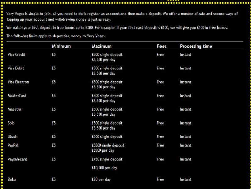O sistema bancário do Very Vegas Mobile Casino é um pouco limitado, mas ainda assim decente para um site de apostas móvel. Depósitos e saques são aceitos via Visa, MasterCard, Paysafecard, Solo, PayPal e Maestro, enquanto saques também podem ser feitos por transferência bancária. Há um limite de saque de £1.000 por dia para saques via PayPal, enquanto cartões de crédito e débito permitem cinco transações por dia, com um limite de £20.000 cada. Os saques levam de 3 a 5 dias para serem processados.Opções bancárias no Very Vegas Mobile Casino