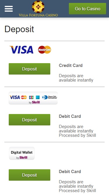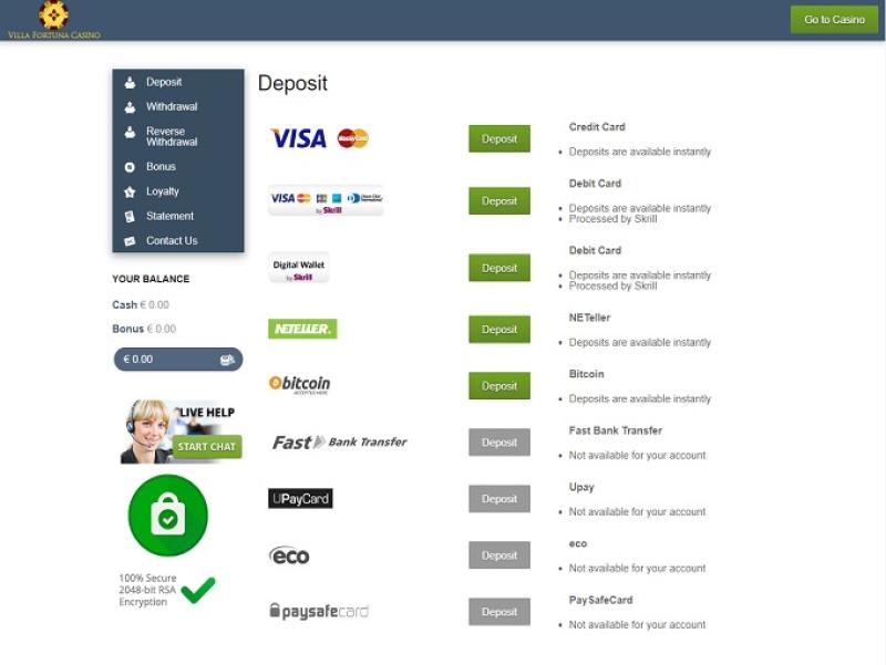 O sistema bancário do Villa Fortuna Casino é bastante razoável, pois o site oferece depósitos e saques via American Express, Giropay, iDeal, MasterCard, Neteller, Paysafecard, Skrill, Sofort, Visa, transferência bancária e transferência eletrônica. Os prazos de pagamento variam de acordo com o método escolhido.