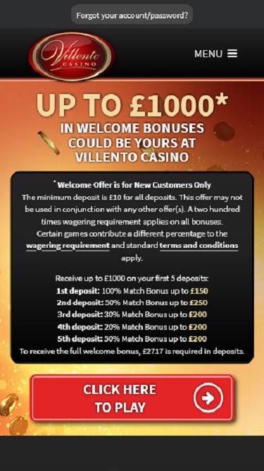 Eu ainda jogo no Villento Casino. Os valores de aposta aqui são baixos para bônus de depósito em comparação com outros cassinos Microgaming em que jogo. Aqui são 30X, em outros cassinos MG em que jogo são 40X e 50X. Com certeza, consigo notar uma diferença com os valores de aposta mais baixos aqui.