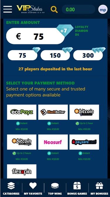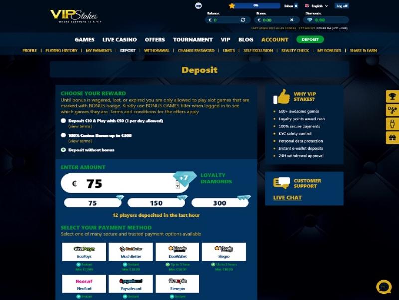 O Vip Stakes é um cassino médio... não tão bom... Você pode ganhar um bônus sem depósito ao se inscrever... Eu me registrei principalmente porque ele usa a moeda euro. Os jogadores também têm uma grande variedade de jogos NetEnt.