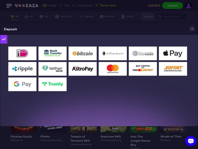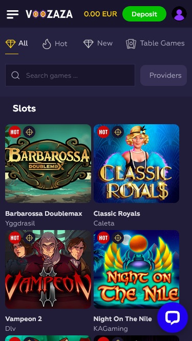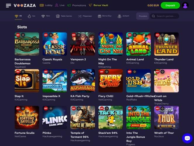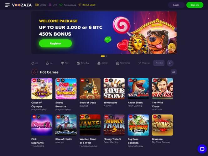 Considerando a abundância de fornecedores de software disponíveis, é natural que o VooZAZA Casino ofereça uma coleção sólida de slots para jogar. Há diversos temas, recursos e bônus para explorar, garantindo diversão para os verdadeiros fãs de caça-níqueis. Entre os jogadores deste cassino, os jogos mais populares são Pink Elephants, Wanted Dead or Alive, Sweet Bonanza, Big Bass Bonanza, Gates of Olympus, The Wild Chase, Tombstone, Book of Dead, Money Train 3, Bonanza e Razor Shark.