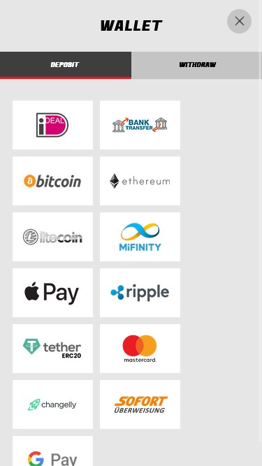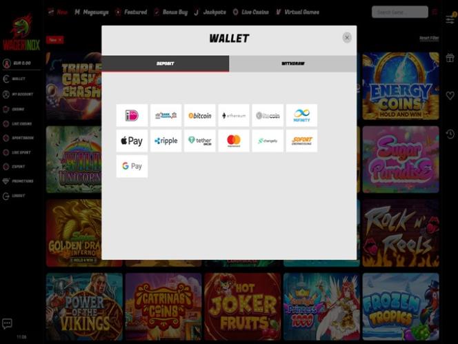 A Wagerinox oferece diversas opções bancárias populares, incluindo carteiras eletrônicas amplamente utilizadas e outros sistemas de pagamento online. Os jogadores podem escolher entre cartões de crédito e débito, transferências bancárias e outros tipos de transferência de dinheiro. Observe que as opções disponíveis variam de acordo com o país, portanto, consulte a seção de pagamentos do cassino para garantir que a sua opção preferida esteja disponível na sua região.