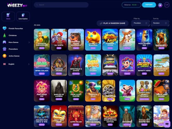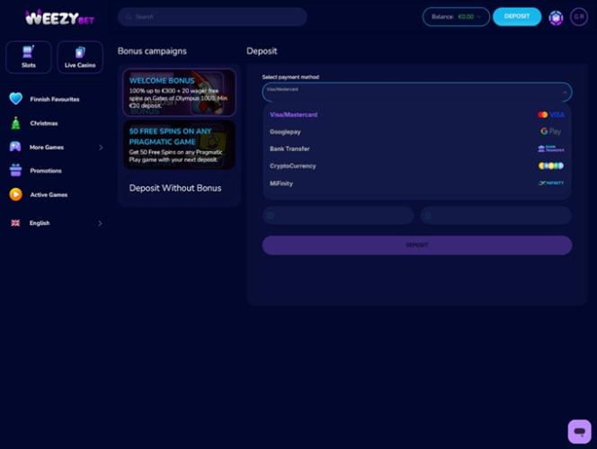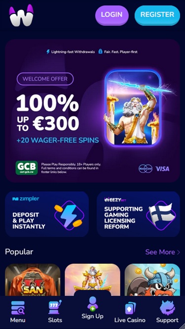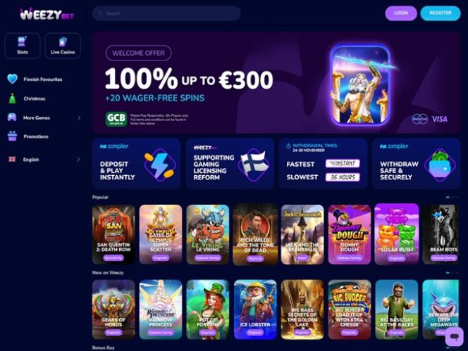 WeezyBet.com é um cassino online regulamentado e licenciado pelo Governo da Ilha Autônoma de Anjouan, União das Comores. Este operador tem como foco jogadores da Finlândia, Dinamarca, Alemanha, Holanda, Itália, Grécia e Canadá. Mesmo que você pertença a outra jurisdição de jogos de azar, fique atento, pois esta marca parece muito atraente à primeira vista.