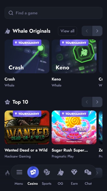 A seção Originais traz : Whale Thor's Rage, Aviatrix , Red Baron Live, Whale Starburst, Whale's Treasure, Whale Plinko, Whale Of Xtreme Fortune, Whale Bingo, WhaleX Plinko, Whale of Fortune…