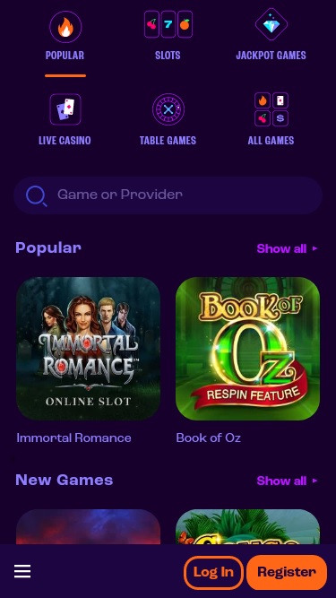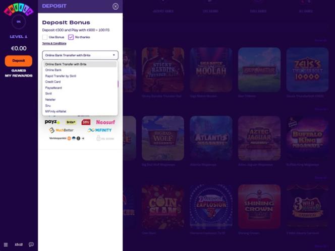 Basicamente, como o Wildz ou o Caxino, um bom cassino. Para mim, a única coisa que não gosto é o design, mais ou menos, o David Haselhoff e o depósito mínimo de 20€. Isso é diferente nos cassinos irmãos. Mas, no geral, o suporte é bom 24 horas por dia, 7 dias por semana, saques rápidos, muitos jogos e um bom sistema de bônus. Confira!
