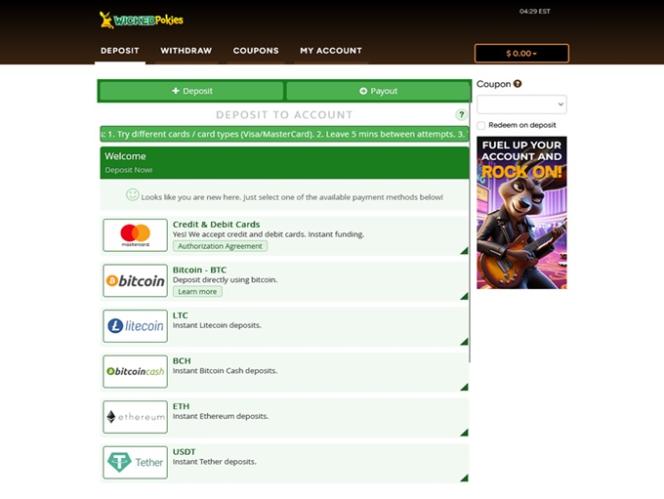 O Wicked Pokies oferece opções bancárias confiáveis. Os jogadores poderão escolher entre métodos tradicionais e modernos. O caixa aceita transações em dólares australianos, Bitcoin, Ethereum, Litecoin, USD Coin e Tether. O cassino oferece cartões de débito e crédito, enquanto os entusiastas de criptomoedas podem fazer depósitos e saques usando moedas digitais populares.