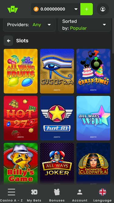 Em termos de categorias e gêneros específicos de jogos de cassino disponíveis, os caça-níqueis online ocupam o primeiro lugar como a opção mais escolhida pelos jogadores. A marca oferece uma seleção impressionante de caça-níqueis com dinheiro real, com um catálogo que apresenta praticamente todos os subgêneros imagináveis, incluindo bônus de compra, pagamentos em cluster, jackpots, Megaways, os lançamentos mais recentes e caça-níqueis clássicos.