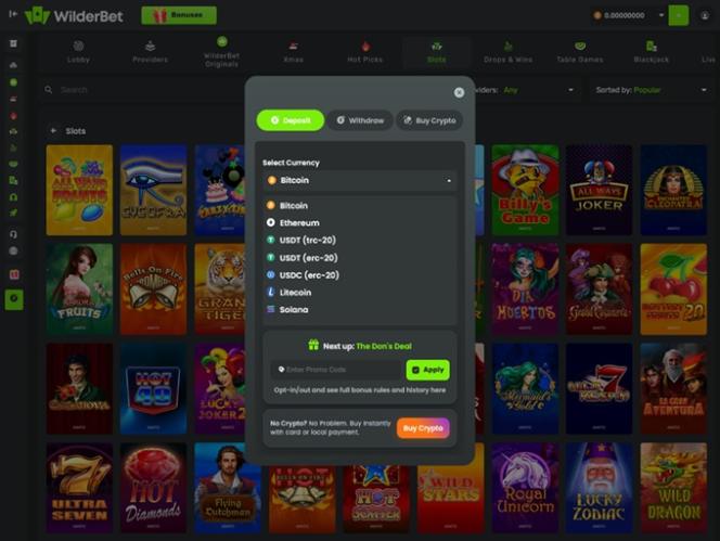 O WilderBet Casino é um site de jogos de azar voltado principalmente para criptomoedas, que aceita diversas criptomoedas para depósitos e saques, incluindo Bitcoin , Ethereum , Litecoin , Solana , USD Coin e Tether. Os jogadores também podem usar métodos de pagamento tradicionais, como Visa , Mastercard e transferência bancária, para adicionar fundos diretamente ao site.