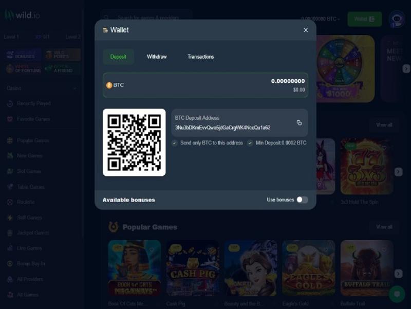 Se você decidir passar seu tempo no Wild.io Crypto Casino, poderá desfrutar de alguns dos melhores jogos de caça-níqueis disponíveis, como Eagle's Gold, Cash Pig, JetX, Buffalo Trail, The Candy Crush, Black Rider, Lord of The Seas, Wild Lady Cash, Hell Hot 100 e muitos outros.