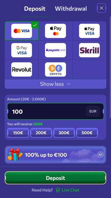 Vale ressaltar que a moeda operacional interna do site é o EUR , mas além dessa moeda, o cassino também aceita outras, como CAD e CHF .