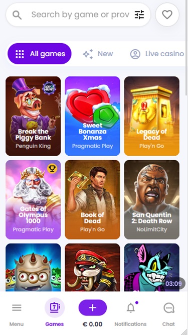 O cassino utiliza uma interface de jogo colorida e atraente, projetada em tons de roxo neon e turquesa, com detalhes glamorosos, brilhantes e futuristas sobre um fundo branco, o que confere à plataforma do cassino uma aparência extremamente moderna e convidativa.