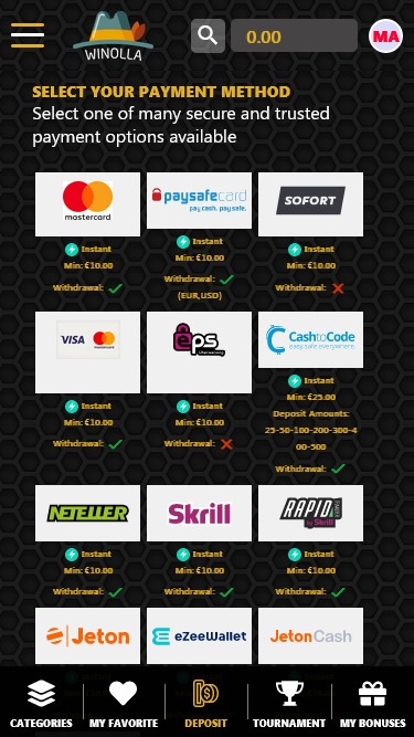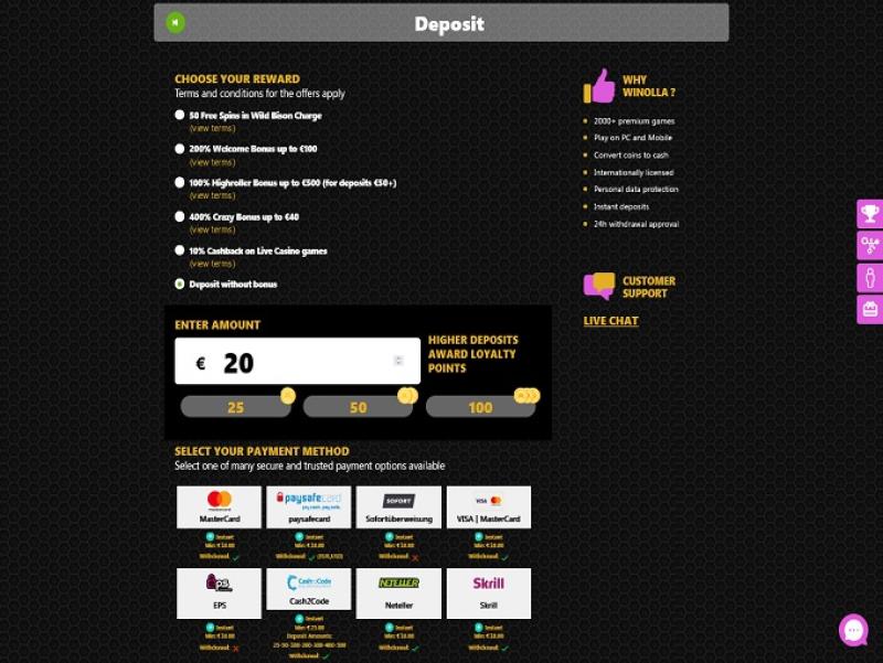 Quanto aos métodos de pagamento, o Winolla Casino oferece aos jogadores a possibilidade de fazer depósitos com opções conhecidas como Visa, MasterCard, Paysafecard, Neteller, Trustly, Astropay e Skrill , entre muitas outras.