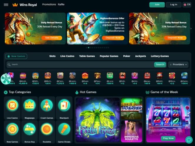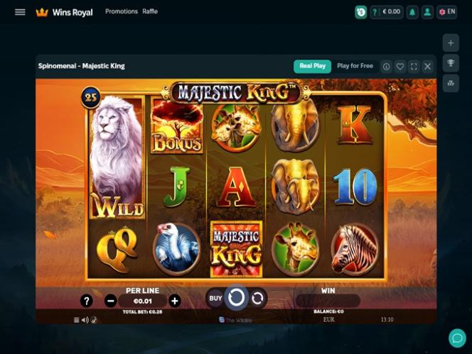 O Wins Royal oferece bônus de cassino fantásticos. Os jogadores podem aproveitar o Bônus de Boas-Vindas Triplo, Giros Grátis semanais e diários, um Bônus de Recarga e cashback diário.