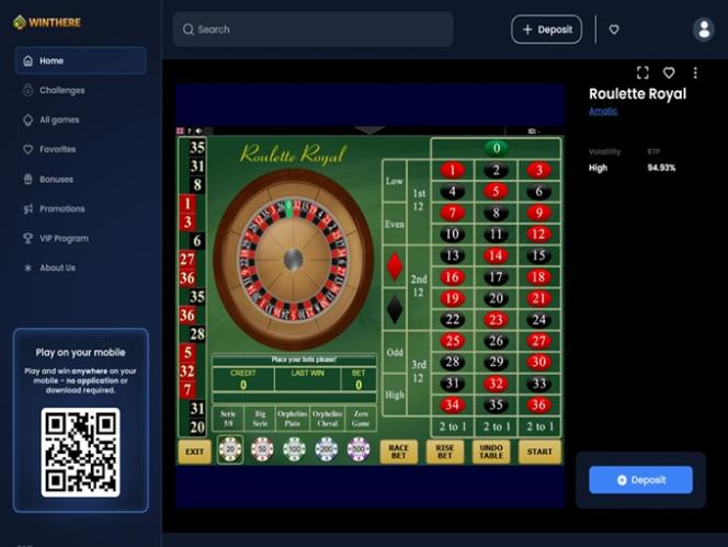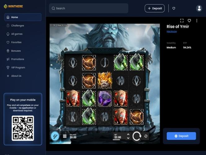 Winthere é um site de jogos de azar moderno que promete proporcionar aos seus jogadores uma experiência inesquecível, oferecendo uma enorme variedade de jogos e atividades, incluindo slots online, jogos com dealers ao vivo e jogos de mesa, além de diversas promoções e bônus. A marca aceita jogadores da Bélgica, França, Reino Unido, Itália, Espanha, Austrália, Canadá e Holanda em seu site e os convida a explorar tudo o que ele tem a oferecer.