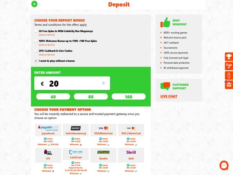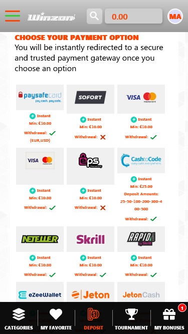 Quanto às opções bancárias, o Winzon Casino oferece ótimos métodos de pagamento. Os jogadores podem escolher entre opções populares como Visa, MasterCard, Neteller e Skrill. Há também a opção de pagar com criptomoedas , que tem sido uma escolha popular há bastante tempo.