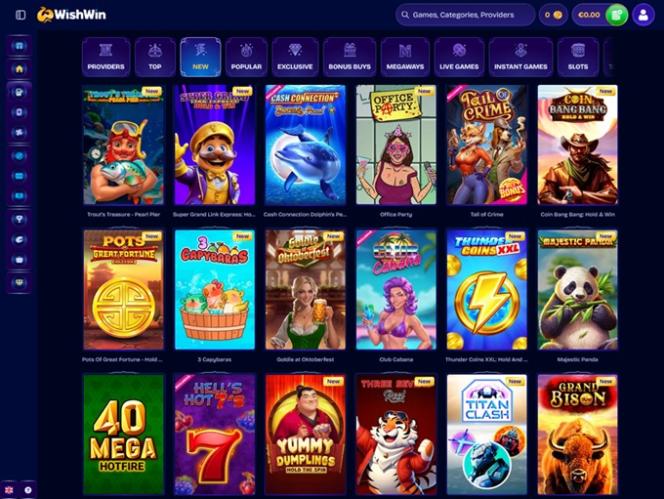 Em primeiro lugar, você pode estar interessado em explorar todos os fantásticos caça-níqueis com dinheiro real disponíveis no Wishwin Casino, já que a marca selecionou uma variedade diversificada desses jogos extremamente populares. O catálogo apresenta praticamente todos os tipos de caça-níqueis imagináveis, incluindo os lançamentos mais recentes, os favoritos clássicos, caça-níqueis com compra de bônus, Megaways, pagamentos em cluster, jackpots e muito mais.