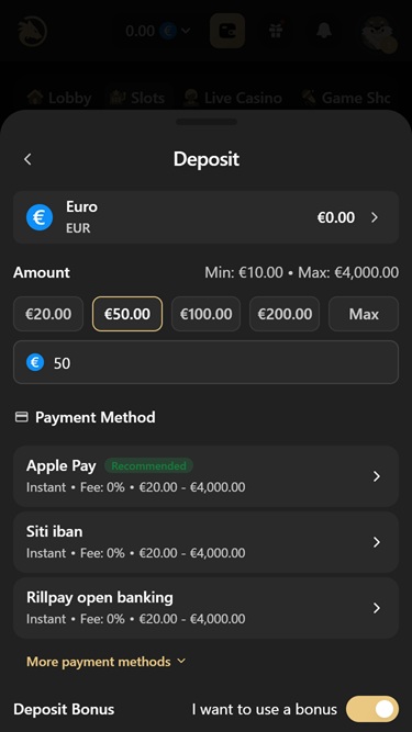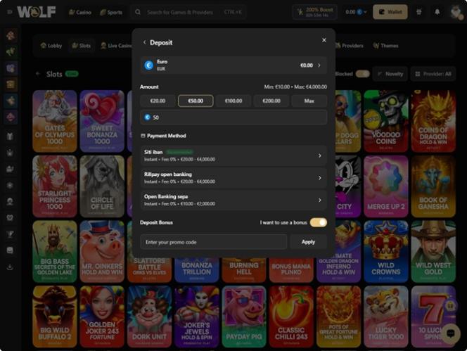 Em relação aos pagamentos, a Wolf.io aceita diversas opções bancárias para depósitos e saques, incluindo escolhas populares como Visa , Mastercard , transferência bancária, Skrill , Neteller, Apple Pay, Google Pay e SOFORT. Além disso, os usuários podem gerenciar fundos em várias criptomoedas, incluindo Bitcoin , Bitcoin Cash , Cardano, Dogecoin, Ethereum , Litecoin , Solana, Tron , USD Coin , Tether e Ripple .