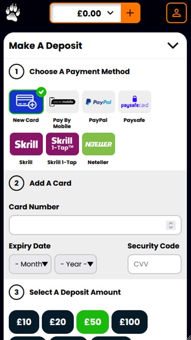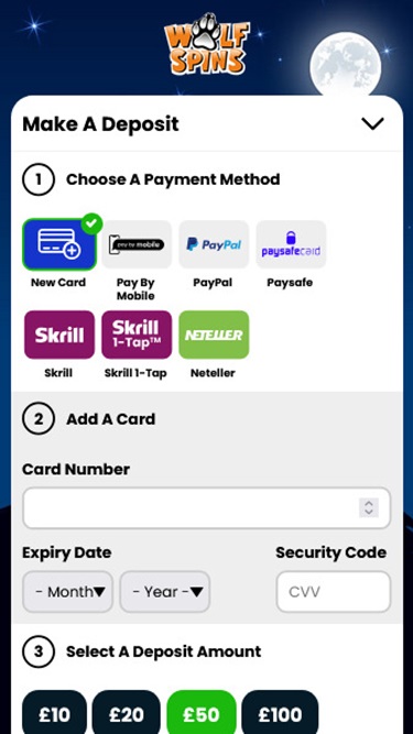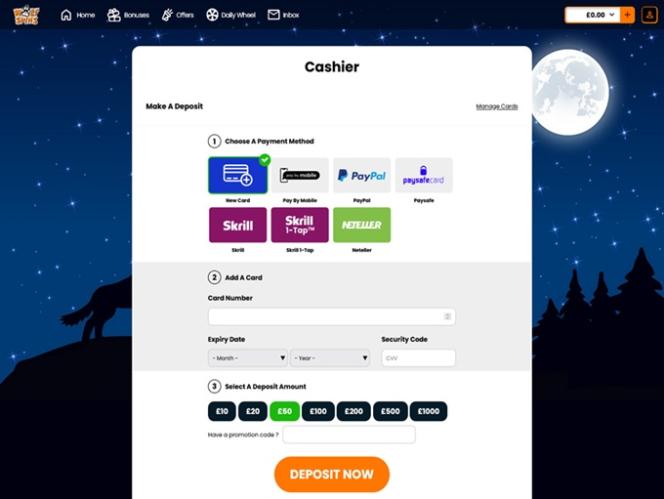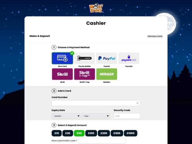 Em relação aos métodos de pagamento, o cassino Wolf Spins aceita diversas opções tradicionais, incluindo Visa , Mastercard , Maestro , PayPal , Paysafecard , Skrill e Neteller . Infelizmente, a marca não aceita criptomoedas até o momento da publicação desta análise.