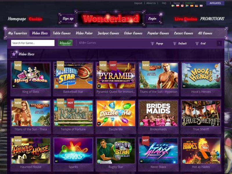 Existem centenas de slots disponíveis para jogar no Wonderland Casino, incluindo títulos de grandes desenvolvedores como Net Entertainment, Rabcat, Microgaming, BetSoft, Leander, NextGen e muitos outros. Há também um bom número de jackpots progressivos disponíveis, oferecendo milhões de dólares em prêmios caso você tenha sorte e acerte a combinação vencedora.