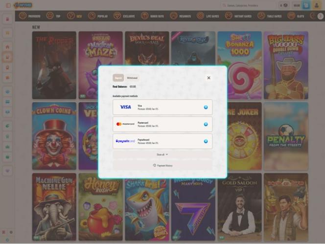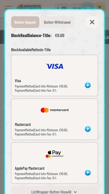 O cassino Wyns oferece diversos métodos de pagamento, como MiFinity, transferência bancária, Neosurf, Nordea, Skrill, Neteller, Visa e MasterCard, entre outros, além de várias opções de criptomoedas como Bitcoin , Bitcoin Cash, Cardano, Dogecoin, Ethereum, Litecoin, Ripple, Tether e USD Coin.