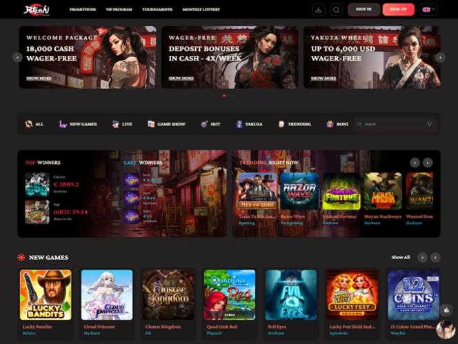 Se você é fã de cassinos online com temática asiática, certamente vai adorar passar um tempo aqui. O ambiente exibe um estilo artístico inspirado na cultura tradicional japonesa e retrata com perfeição todos os seus elementos característicos, como os temíveis samurais e os membros da Yakuza.