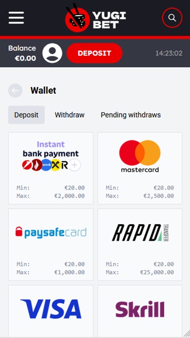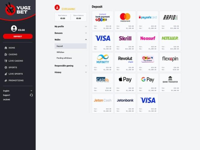 Jogadores que preferem usar criptomoedas como seu principal método de pagamento ficarão desapontados ao saber que não há opções disponíveis para esse fim. Por outro lado, se você deseja depositar e sacar dinheiro usando opções populares como Visa, Mastercard, Neteller, Skrill, Paysafecard, Neosurf, JetonCash e outras, ficará feliz em saber que poderá fazê-lo sem qualquer problema.