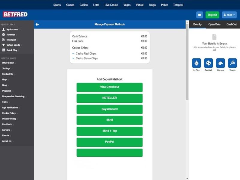 Os métodos de depósito incluem Maestro, Visa, Visa Electron, Mastercard, Neteller, PayPal, Skrill, Paysafe, transferência bancária e lojas Betfred.