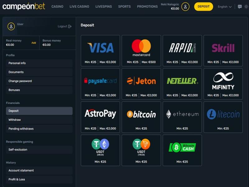 Métodos de depósito: Visa, SEPA, Neteller, Skrill, Jeton Wallet, Pay Safe Card, Eco Payz, i-Deal, Giro Pay, MuchBetter, Neo Surf, Safe Charge, E-Pro, E-Voucher, Mi Finity, Rapid Transfer, Bitcoin Cash, Bitcoin, Ethereum e Litecoin.