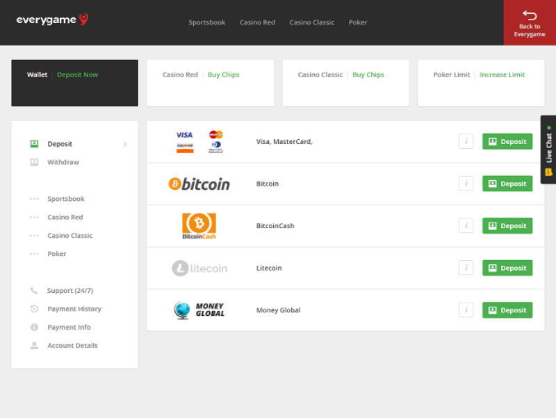 As opções de depósito incluem: Visa, MasterCard, Discover Card, Diners Club Card, Skrill, Skrill 1 – Tap, Bitcoin, Bitcoin Cash, Litecoin, Neteller, EcoPayz, PaySafe, Transferência Bancária SEPA da UE, EZee – Wallet e MoneyGram.