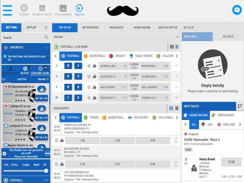 Este novo e empolgante provedor de jogos online, cassino e casa de apostas esportivas busca impressionar apostadores esportivos em todo o mundo. A marca pertence e é operada pela Marketplay LTD, uma empresa regida e regulamentada pelas leis e limitações de Malta. As opções de jogos neste site são gerenciadas e fornecidas pela Aspire Global International LTD. A página de apostas esportivas do Mr. Play é limpa, concisa e fácil de navegar, e possui todos os recursos que se espera de um ambiente de apostas esportivas de primeira linha.