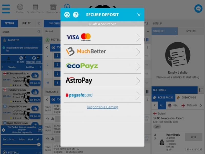 Métodos de depósito: Visa, MasterCard, Skrill, Neteller, MuchBetter e EcoPayz. Todos os métodos de depósito devem disponibilizar os fundos imediatamente.