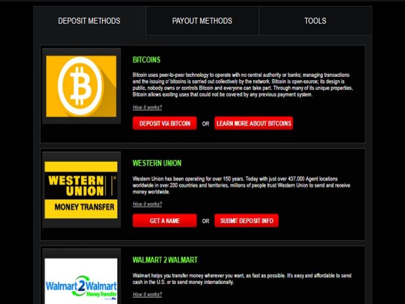 Métodos de depósito : Visa, MasterCard, Discover, American Express, Bitcoin, Bitcoin Cash, Ethereum, Dash, Cardano, Cartão-presente pré-pago, Walmart para Walmart, Western Union, MoneyGram, Transferência bancária, Depósito bancário em dinheiro, Ordem de pagamento, PayPal para PayPal, Zelle Pay , Litecoin, Ripple, Stellar e USD Coin.