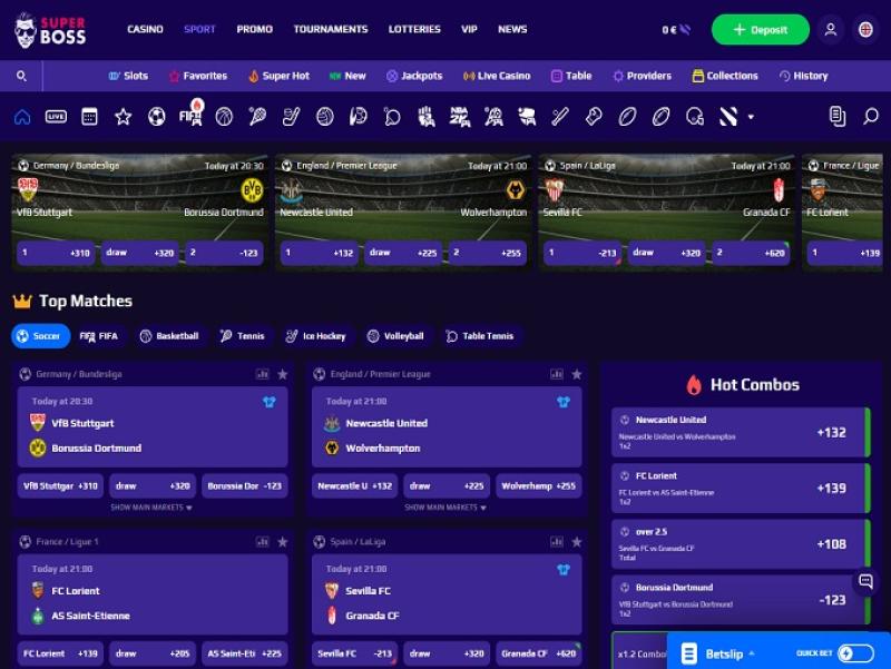 A casa de apostas esportivas Super Boss, assim como seu cassino online, oferece um excelente ambiente para apostas esportivas online, que pode servir de modelo para a apresentação e o funcionamento de um site moderno de jogos e apostas. À primeira vista, a seção de apostas esportivas deste moderno destino online impressionará e atrairá até mesmo os jogadores de apostas esportivas mais experientes. Você notará uma grande diferença entre a casa de apostas esportivas Super Boss e alguns de seus concorrentes recentes. O design deste site é excepcional e visualmente atraente. Ele permite que seus clientes visualizem uma ampla variedade de opções de apostas esportivas. É fácil de navegar e oferece tudo o que um profissional de apostas esportivas esperaria de uma casa de apostas online, exceto corridas de cavalos, que não estão disponíveis no momento.