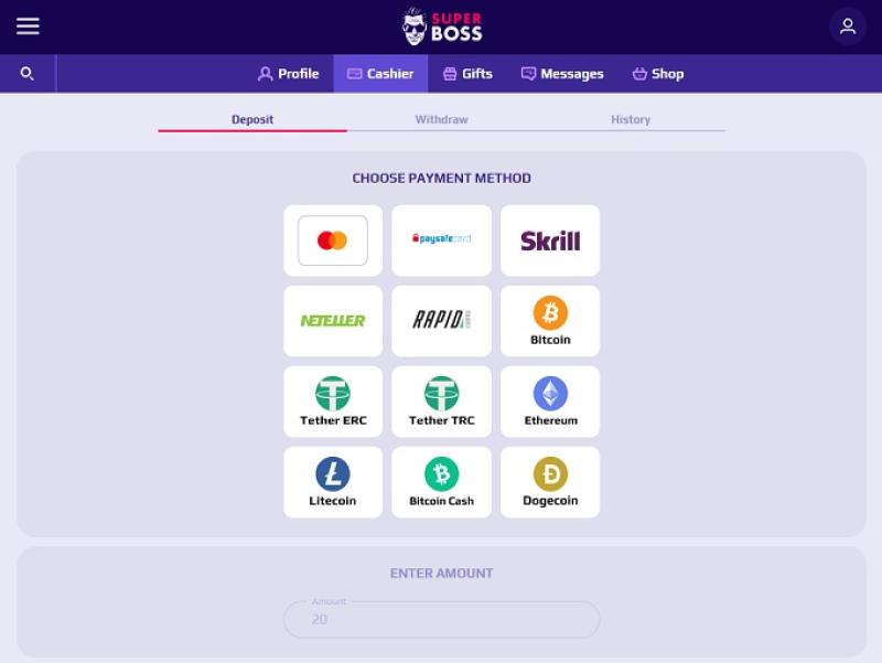Métodos de depósito: Visa, MasterCard, Bitcoin, Litecoin, Ethereum, Tether, Bitcoin Cash, Dogecoin, MuchBetter, Neteller, NeoSurf, Skrill, Cash to Code, Rapid Transfer e PaySafeCard. Todos os métodos de depósito devem disponibilizar os fundos imediatamente.