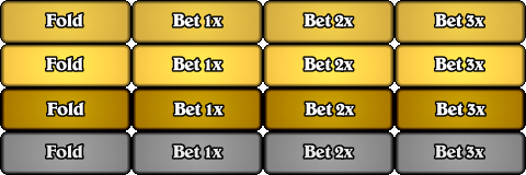 Após a distribuição das cinco cartas, dependendo da sua mão, você verá o botão "Desistir" e um ou três botões adicionais oferecendo apostas de 1x, 2x ou 3x. Quando a mão for jogada, todos os botões se transformarão temporariamente nos ícones "Repetir" e " Limpar" . Ao pressionar "Repetir", você recarrega a configuração anterior de aposta inicial/Super Bônus com um único clique; ao pressionar "Limpar", você opta por definir uma nova aposta.