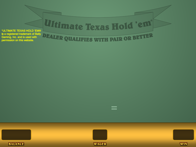 Divirta-se com o seguinte jogo online de Ultimate Texas Hold 'Em®. É necessário, no mínimo, JavaScript. Java também é necessário para oferecer dicas precisas. Se você não tiver o Java instalado ou habilitado, as dicas de estratégia para a decisão de aumentar o dobro da aposta só poderão ser oferecidas em situações óbvias (aumentar com uma sequência ou mão melhor).