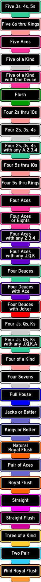 Assim como na variante Bonus Poker , a tabela de pagamentos do Double Bonus Poker — localizada discretamente na parte superior da tela, visível durante toda a partida e informando claramente o valor da aposta escolhida — recompensa progressivamente as Quadras em três níveis ( de 2 a 4, de 5 a Rei e Ases ).