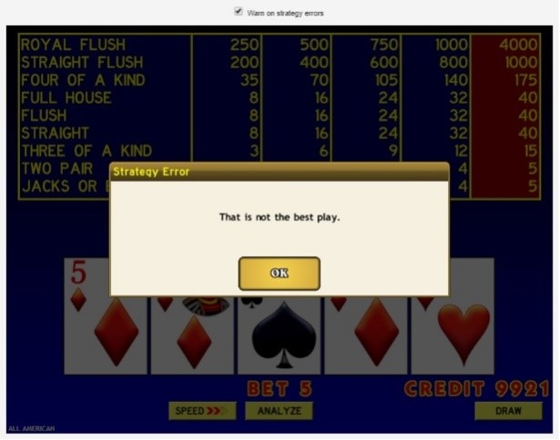 Quando a caixa "Avisar sobre erros de estratégia", localizada logo acima da interface do jogo, é ativada, uma janela pop-up aparecerá sempre que uma jogada melhor puder ser feita. Dessa forma, o recurso é útil para aprender as regras do pôquer em geral, bem como as regras específicas do All American.