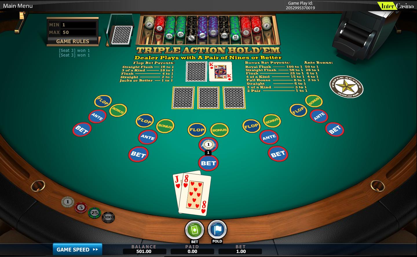 Em todos os jogos é possível apostar em várias mãos. No InterCasino, os limites disponíveis são de £1 a £100, de £5 a £250 e de £15 a £500.