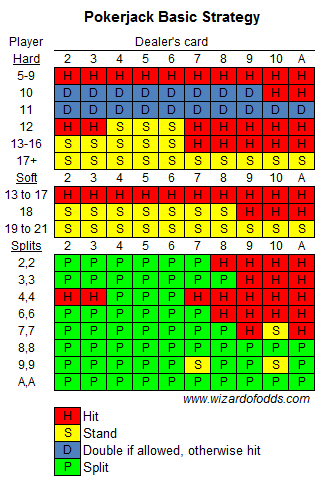Pokerjack é um jogo de blackjack com duas apostas paralelas baseadas no pôquer. A diferença é que, se o jogador dividir sua mão de blackjack, ele também deverá dividir suas apostas paralelas. As probabilidades das apostas paralelas não são muito boas, então eu as deixaria de lado para que você não seja tentado a manter um par que deveria dividir de qualquer maneira.