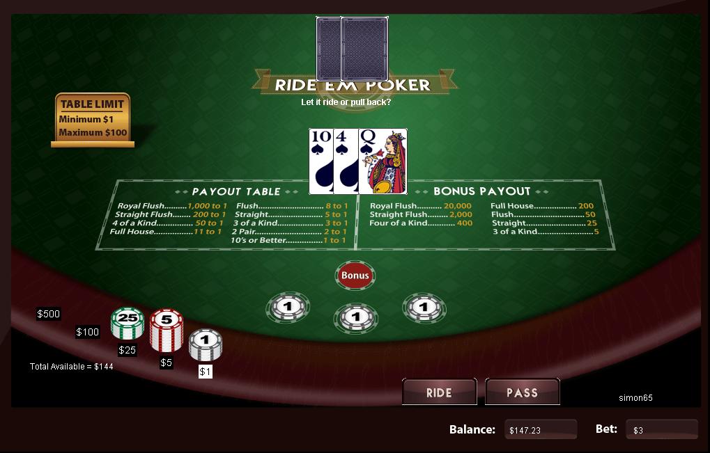 Este jogo é chamado de "Let it Ride" no menu, pelo menos no cassino Drake, mas aparece como "Ride Em Poker" nas mesas. Não gosto muito de mudar o nome de um jogo numa tentativa pouco convincente de evitar o pagamento de direitos autorais, então vou continuar chamando-o de Let it Ride .