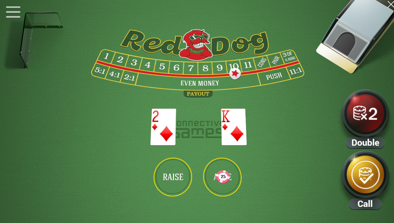 Red Dog é jogado com as regras usuais e seis baralhos de cartas. Com a estratégia correta, que consiste em aumentar a aposta com um spread de 7 ou mais, a vantagem da casa no jogo base é de 2,798% com base na aposta Ante e de 2,375% com base na soma das apostas Ante e Raise.