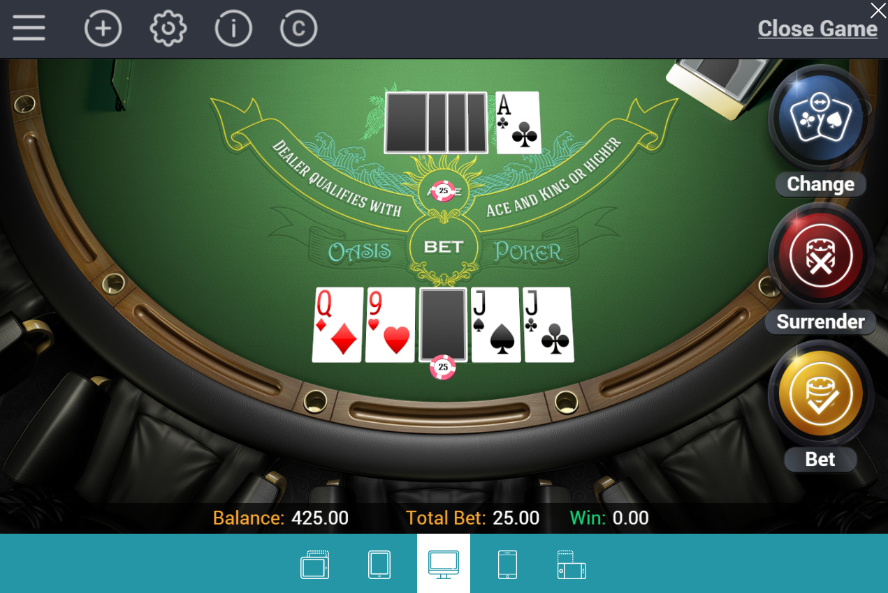 Para quem não conhece o jogo, Oasis Poker é semelhante ao Caribbean Stud Poker, com a diferença de que o jogador pode trocar uma carta pelo valor do Ante antes de decidir se aumenta a aposta ou desiste. O jogador pode, inclusive, trocar duas cartas simultaneamente, pagando o dobro do Ante, mas a estratégia correta indica que nunca se deve trocar duas cartas ao mesmo tempo.