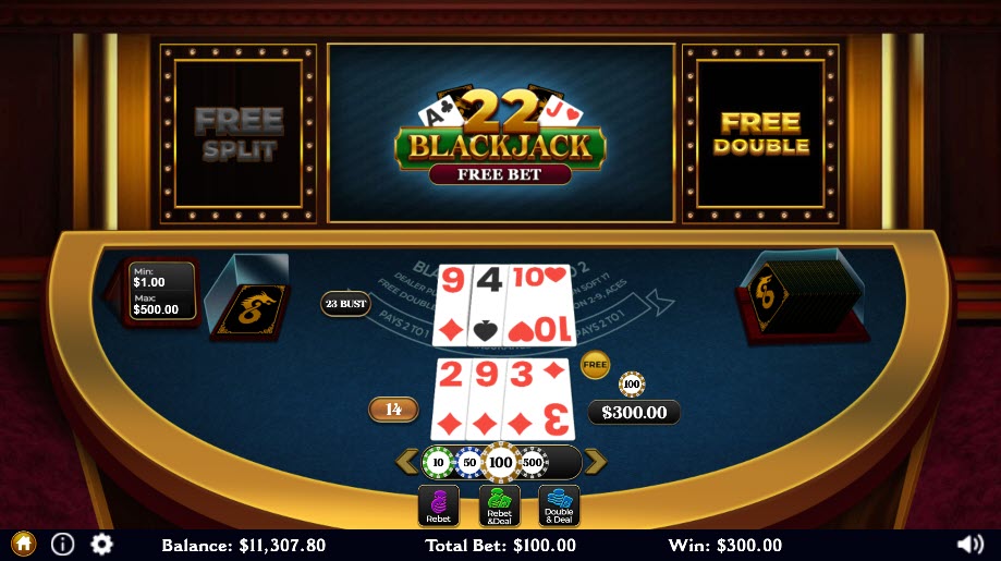 Neste jogo, o jogador pode dobrar (em uma mão difícil de 9 a 11) ou dividir (em qualquer mão, exceto 10) gratuitamente. A condição é que, se o dealer fizer 22, todas as apostas restantes serão consideradas empate. A Dragon Gaming afirma que o jogo tem uma vantagem da casa de 1,55%. Pelas regras padrão, minha vantagem da casa é de 1,04%. Para mais informações, consulte minha página sobre Blackjack com Aposta Grátis .