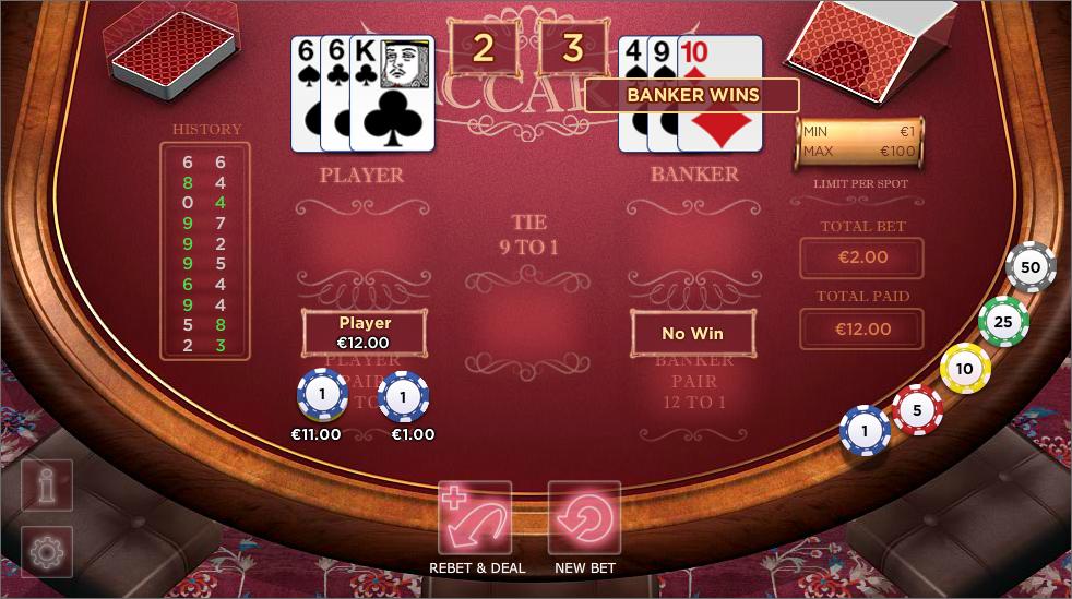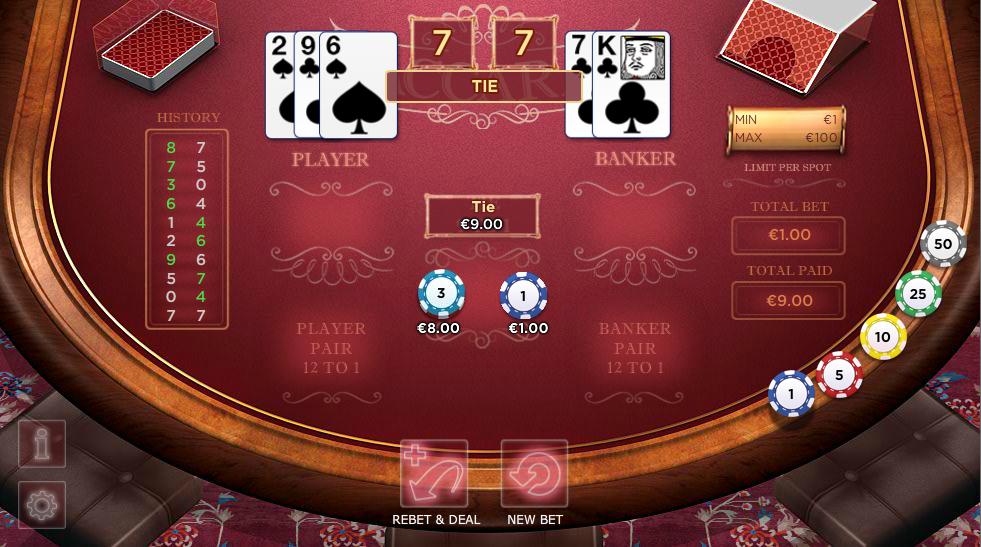O Bacará segue as probabilidades usuais e é jogado com seis baralhos. É importante notar que a descrição na mesa está incorreta ao afirmar que o empate paga 9 para 1 e o par paga 12 para 1. Após jogar ambas as apostas até ganhar, o que acontece é que se paga 9 para 1 no empate e 12 para 1 no par.