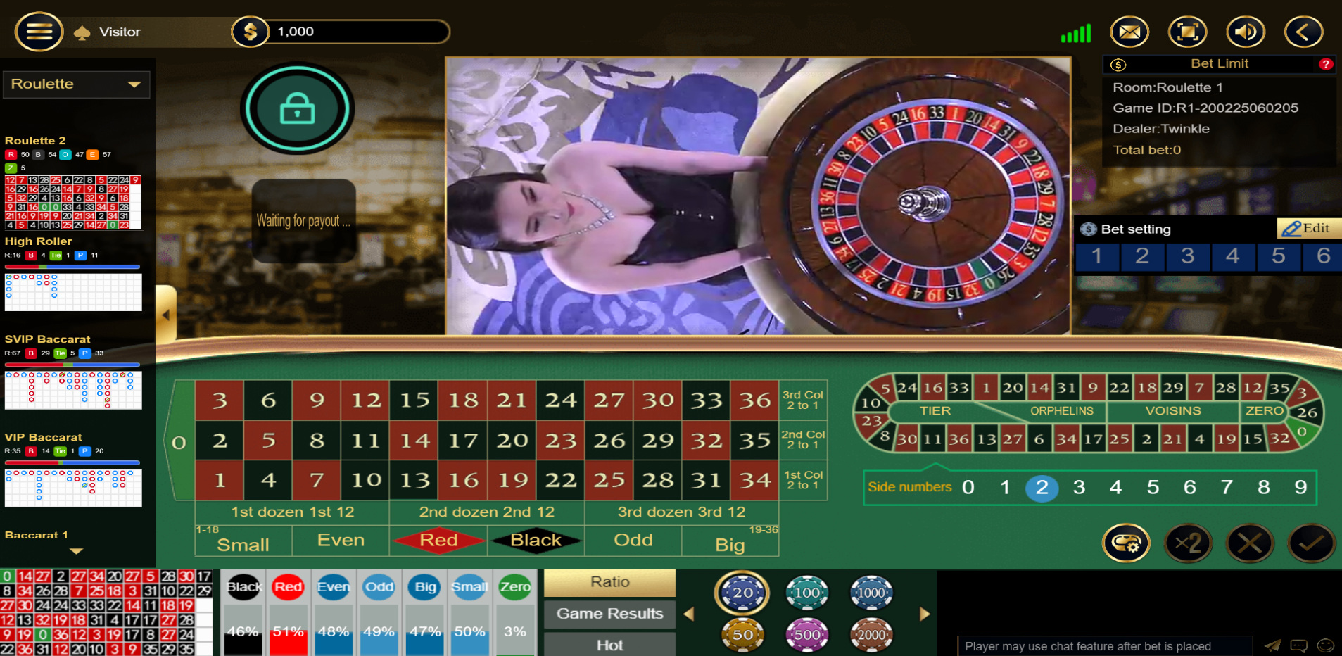 A interface do sic bo é bem feita, com a câmera posicionada de cima para baixo, em um ângulo e distância atraentes, mostrando o crupiê. No entanto, as probabilidades são bem ruins, como você pode ver na tabela a seguir. Meu conselho é que, se você for jogar, aposte apenas em números baixos, altos, ímpares e pares.