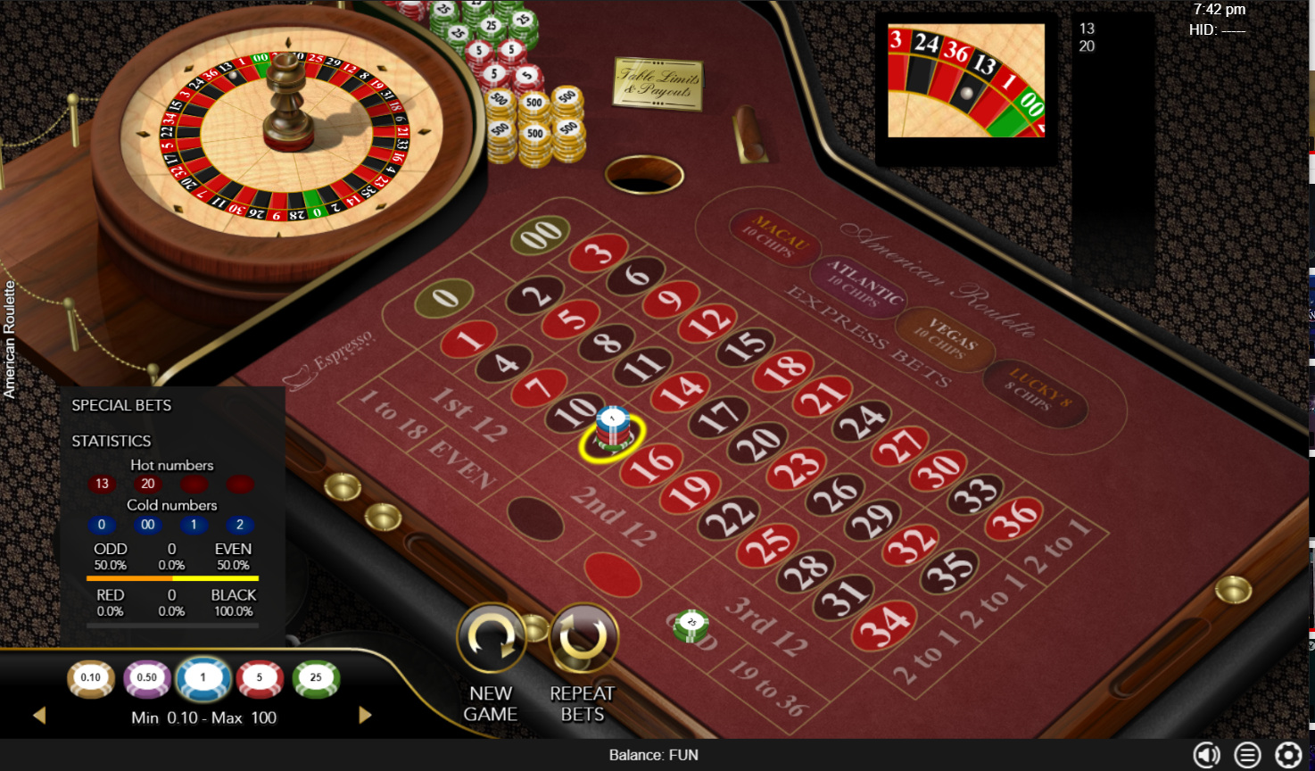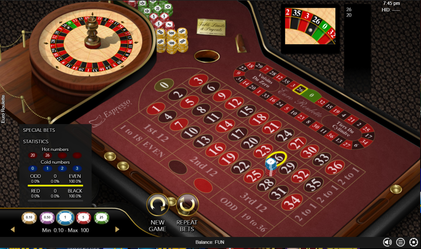 - Roleta Europeia — É o que eu chamo de "Roleta Francesa", onde as apostas com probabilidades iguais perdem metade quando a bola cai no zero. Isso resulta em uma vantagem da casa de 1,35% nas apostas com probabilidades iguais e 2,70% em todas as outras. Não há roleta melhor do que essa, e o Espresso é um dos poucos lugares que oferecem essas regras tão generosas.