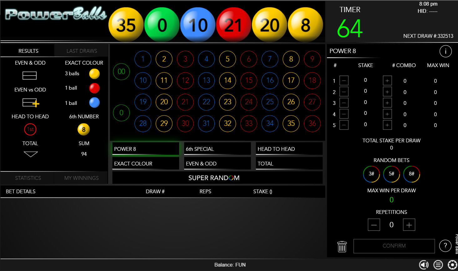 Power Balls é um jogo do tipo keno/loteria. Seis das 38 bolas são numeradas (de 1 a 36, 0 e 00). Há 12 bolas vermelhas, 12 azuis, 12 amarelas e duas verdes. Existem diversas maneiras de apostar no resultado. Já analisei jogos semelhantes antes, então peço desculpas se não analisar todas as apostas. Para ter uma ideia do retorno, considerei apenas as apostas em que o jogador escolhe uma cor (vermelha, azul ou amarela) e quantas bolas dessa cor aparecerão. A tabela a seguir mostra o pagamento de cada aposta, a probabilidade de ganhar e o retorno esperado. Como você pode ver, todas pagam perto de 95%, exceto a aposta em que todas as seis bolas correspondem à cor escolhida.